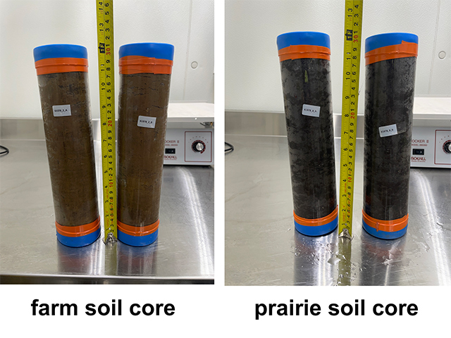 A side-by-side comparison of soil samples taken from agricultural land and soil samples from an undisturbed prairie show a difference that's visible even to the naked eye. To better inform how we might be able to mimic nature in our agricultural practices, Danforth Center researchers hope to learn more about what separates the two soils on a microbial level.