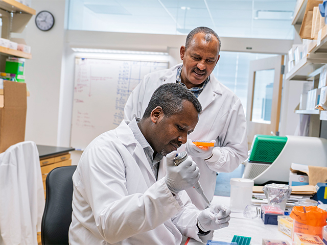 Ibsa Merga (foreground) trains at the Danforth Center under Getu Duguma, PhD, (background) as part of the GET-UP project, which aims to deliver high-yield, climate-resilient varieties of tef to smallholder farmers in Ethiopia.