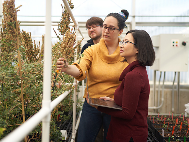 Malia Gehan, PhD and her team study diverse crop species (quinoa, maize, and brachypodium,a model grass related to wheat and rice) to compare the mechanisms and strategies plants have evolved to respond to heat. There can even be large differences in heat response within a species because they have become adapted to their local environments. For example, Oliver Walters-Clift, a summer intern participating in our REU Field and Laboratory Learning in Plant Science program is working on a project with Autumn Brown and Sam Kenney in the lab, to understand how heat is impacting pollen viability in a quinoa variety that is higher yielding in heat than a widely used research variety. By understanding the range of responses and natural variation, we can better prepare crops for the future.