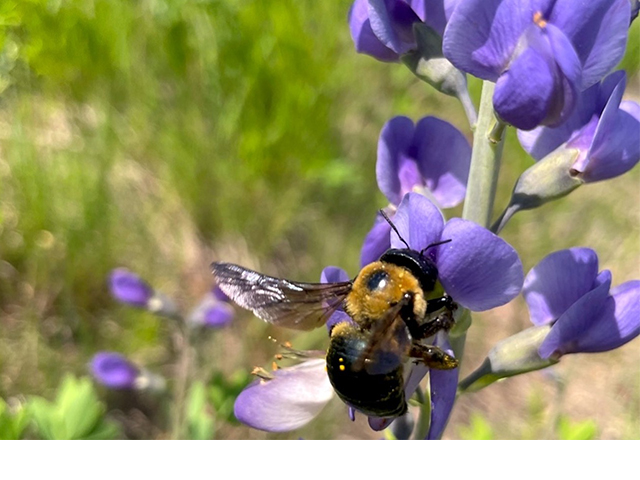 An eastern carpenter bee (Xylocopa virginica) lands on flowering blue false indigo (Baptisia australis).