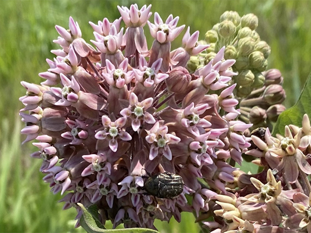 A dark flower scarab (Euphoria sepulcralis) crawls on the flower of a common milkweed (Asclepias syriaca).