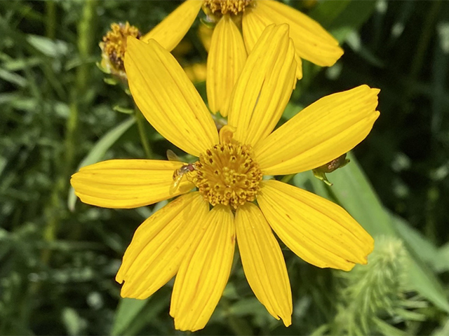 Yellow daisy-like flowers with flat yellow centers sit atop upright stems from late spring to midsummer. The leaves grow up the stem and divide into three narrow lance shaped segments that do not protrude into the base of the leaf. This Missouri native perennial provides both nectar and pollen and attracts an array of pollinators. It is a host plant for some Lepidoptera (moth and butterfly) species, and its seeds provide food for songbirds and small mammals.