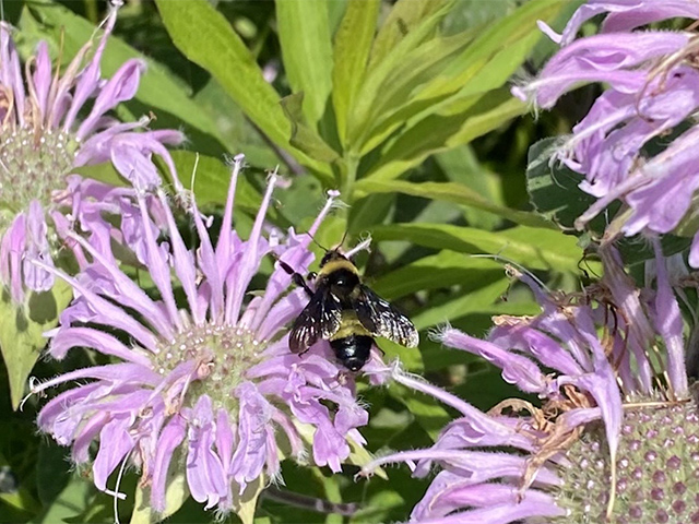 A black and gold bumblebee (Bombus auricomus) pollinates a flowering bee balm (Monarda fistulosa).