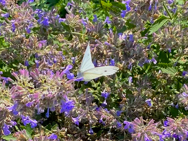 A cabbage white (Pieris rapae) moth visits a catmint (Nepeta sp.) plant.