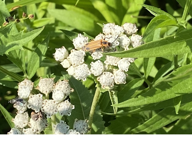 This clump-forming native perennial has white flowerheads with tiny ray flowers on broad terminal corymbs with rough toothed leaves and large basal foliage. Blooming from late spring to early summer, this plant attracts an array of pollinators, providing them with nectar and pollen. This plant also provides habitat for many species, including the leaf cutter bees as the females will use its leaves in their nests.